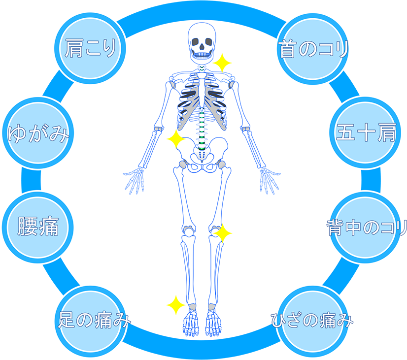 肩こり、腰痛、膝痛、手足の痺れ、ケガなど、日々の生活の中で起こりやすい体の痛みや違和感の診療を行います。
